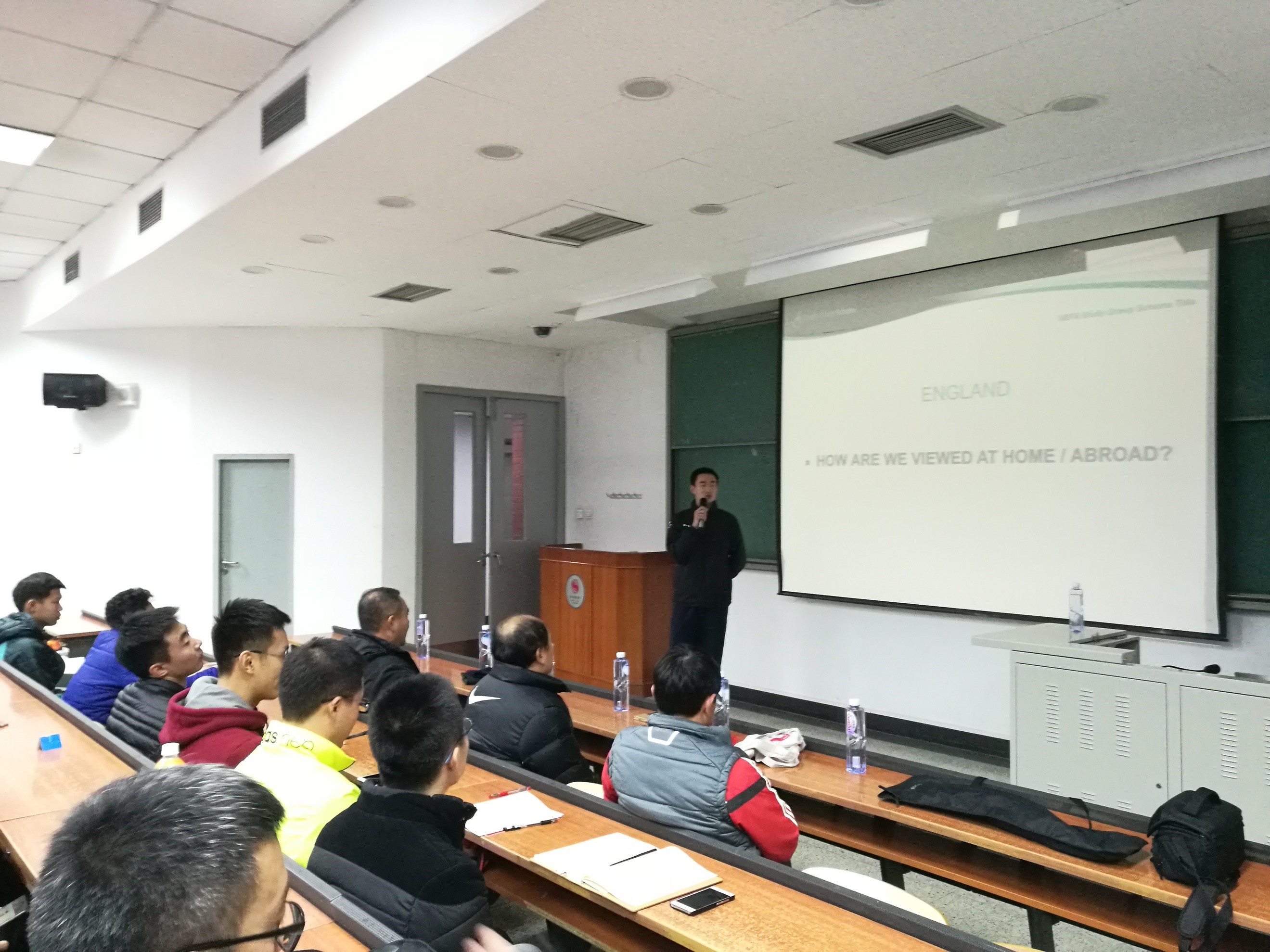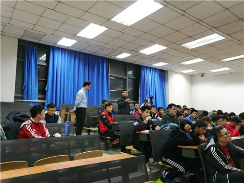 在英国青训主题板块,井伟祯同学从英国足球发展史、英国本土精英球员在职业俱乐部的数量现状、精英球员表现计划、精英球员表现计划实施原则以及评级指标、英足总对精英球员培养的具体措施等几个方面对英国青训情况进行了系统的阐述,并重点分析了精英球员表现计划实施状况;在中国足球发展评估板块,井伟祯同学从教练员培训、青少年足球运动员发展、场地设施和组织结构等方面对中国足球发展情况进行了系统的阐述。报告的逻辑性和系统性非常强,得到了在场广大师生的阵阵掌声。在提问与讨论环节,同学们也就足球技术调研等话题与井伟祯同学进行了精彩地交流与探讨,场面非常热烈。