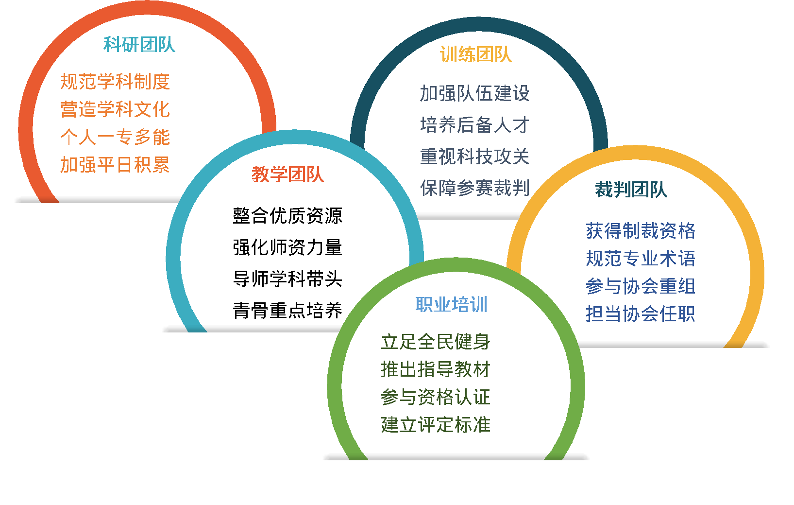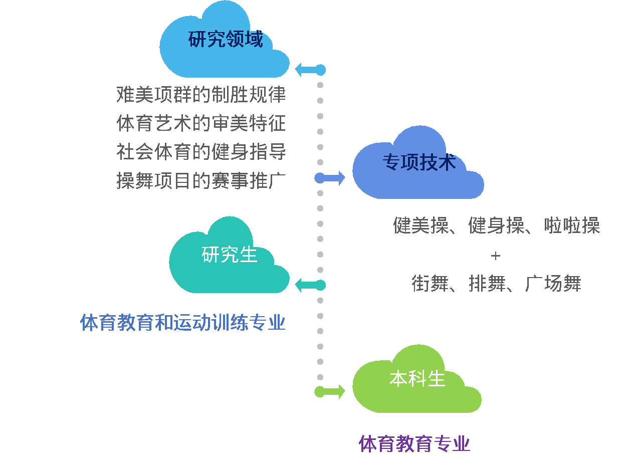 以“健康中国”为使命,整合健美操、啦啦操、健身操、街舞、排舞、广场舞六个技术专项(三操三舞),以及专项制胜规律、艺术审美特征、健身指导评价、体育竞赛表演四个团队建设领域。让基层教研室的教学、训练、科研、社团、职业五大团队成为体大“双一流”建设的生力军。