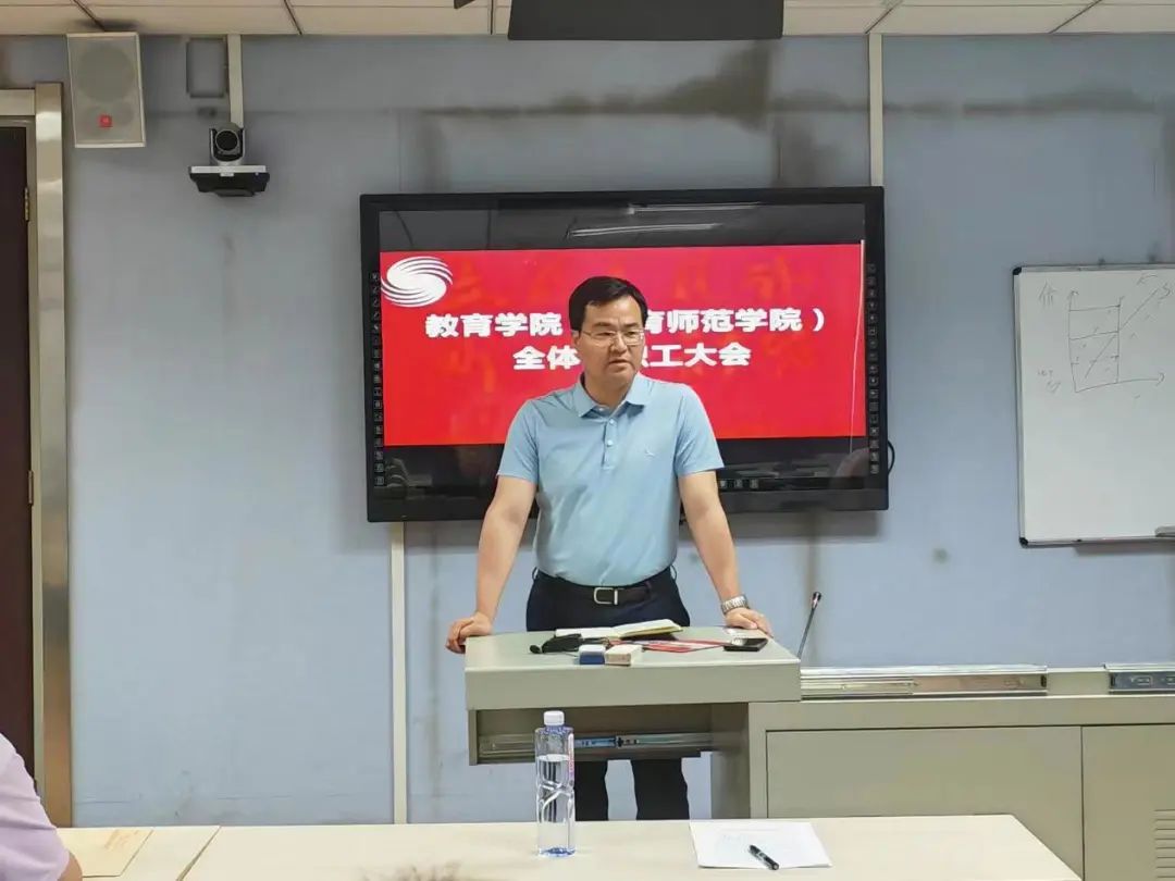 为深入开展学习贯彻习近平新时代中国特色社会主义思想主题教育,统一思想,凝聚共识,推进学院各项工作取得成效,2023年6月9日,304am永利集团(体育师范学院)在教学楼213教室召开全体教职工大会,公司党委常委、副董事长周启迪,学院经理、分党委副书记王华倬,学院分党委副书记李杰,学院副经理刘昕,学院全体教职工参加了会议。会议由分党委副书记李杰主持。