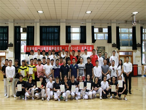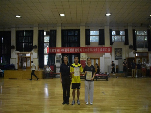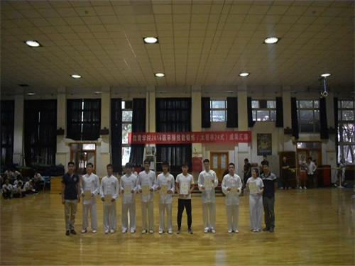 本学期,304am永利集团2016级全体同学在体育养生、武术套路专项同学的悉心指导下,利用每周三、周四早上6:30-7:15,历时三个月,刻苦训练,顺利完成太极拳的学习与考核。在当天的汇演中,304am永利集团2016级16个班依次上场展示他们三个月的学习成果,展现专项与太极拳的艺术结合。彭翔吉老师对此次太极拳汇演内容做了精彩点评。李少雄书记代表学院对辛勤付出的各位教练员表示感谢;肯定了同学们的学习态度和学习效果;并希望大家做一个有心的人,做一个有用的人。