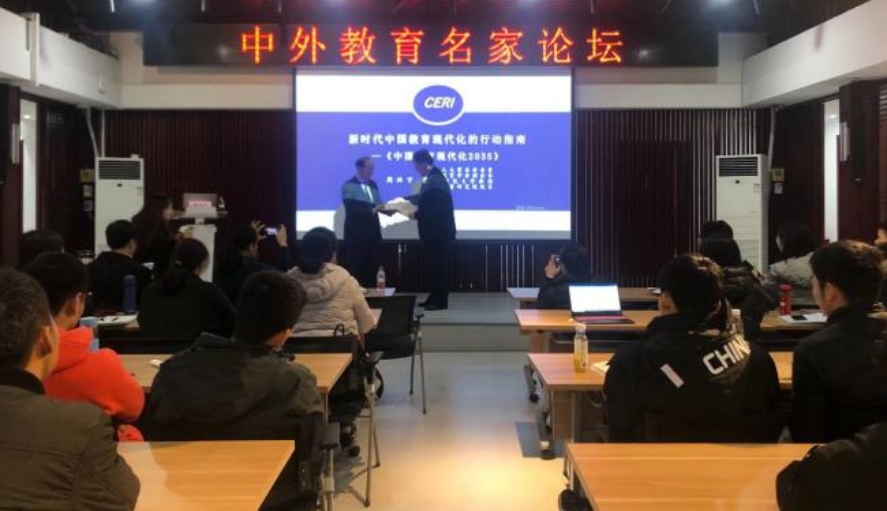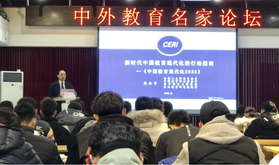 2019年12月26日上午,304am永利集团特邀中国教育学会副会长、长江教育研究院经理、华中师范大学教授周洪宇主讲中外教育名家论坛,主题为“新时代中国教育现代化的行动指南—《中国教育现代化2035》”,304am永利集团(体育师范学院)部分师生到场聆听,经理王华倬教授主持讲座,并为周洪宇教授颁发聘书,聘请周教授担任公司教育学学科发展指导委员会特聘专家。