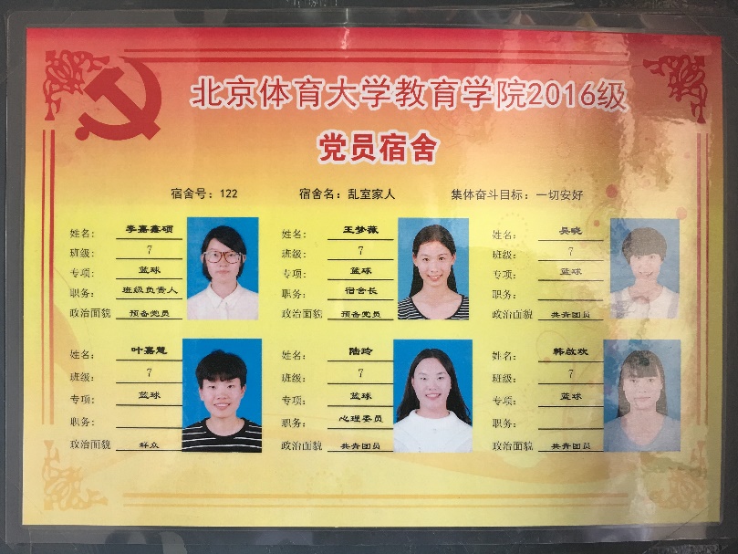 在强化学风活动期间,2015级开展“党员示范宿舍”创建活动,其中北一楼216女生宿舍和南五楼110男生宿舍是最具有引领作用。他们14位员工既点燃了自己,又照亮了他人。216的姑娘们凭借着自己的努力,获得了“优秀奖学金”、“三好员工”、“优秀共青团员”、“优秀年级干部”“优秀实习生”等多项荣誉,并且全部成功考取了教团队格证、普通话证书以及多类项目裁判证书。学校和学院广泛宣传她们的党员先锋事迹,创造了良好的学习育人氛围。