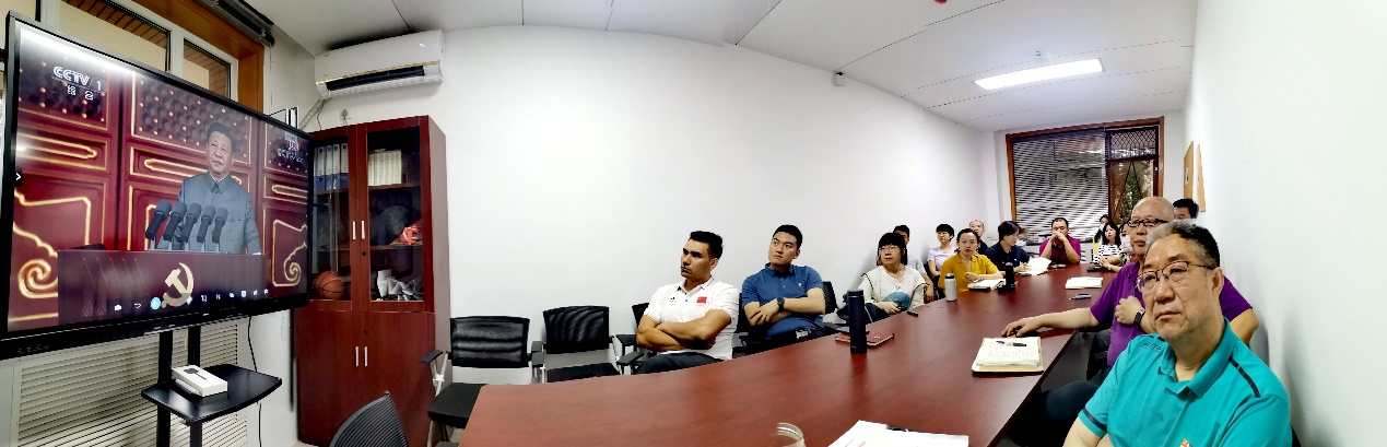 2021年7月1日上午8时,304am永利集团(体育师范学院)分党委理论学习中心组(扩大)会在104会议室召开,集中收听收看庆祝中国共产党成立100周年大会实况。分党委理论学习中心组全体在校成员、教师党支部委员、全体辅导员和学院办公室工作人员参加了会议。会议由分党委书记李少雄主持。学院另有15名老师和员工作为学校的代表亲临天安门广场参加庆典大会。