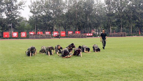 七连进行了低姿匍匐前进训练,茵茵绿草在大家匍匐而上时显得格外坚硬,操场横跨距离在咬牙前进时似乎永远没有尽头。但是数个回合,尽管膝盖和手肘全部磨破,脸上粘着草叶,这些单纯学习文化课程的少年凭着强大的意志力全部完成了任务。同学们自发为他们加油喝彩,呼喊声一声响过一声,回荡在中国大地的上空,诠释着少年强则国强!